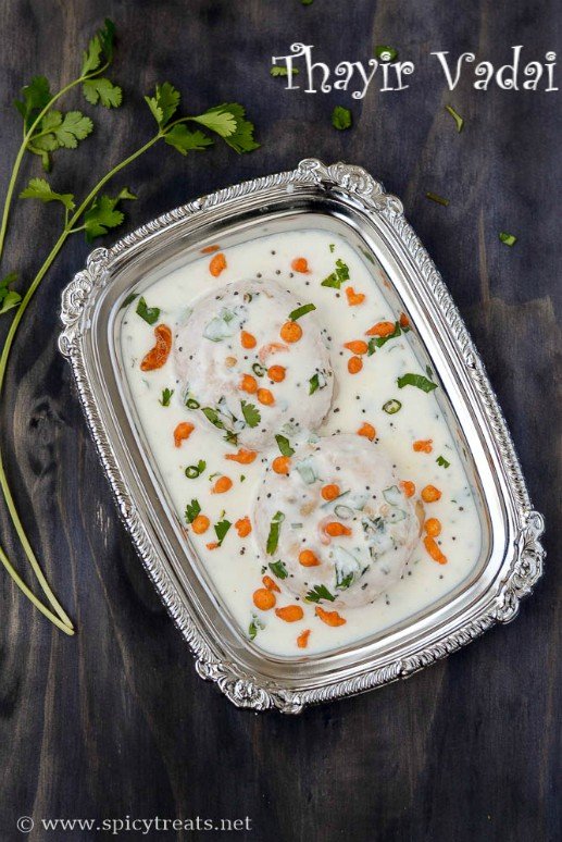 Soft lentil fritters soaked in creamy yogurt, seasoned with a hint of green chili, curry leaves, and mustard seeds for a refreshing and tangy treat.